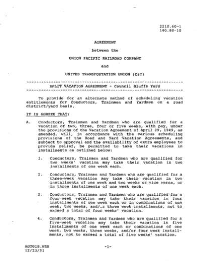 AGREEMENT between the UNION PACIFIC RAILROAD COMPANY and UNITED TRANSPORTATION UNION (C&T) SPLIT VACATION AGREEMENT - Council Bluffs Yard To provide for an alternate method of scheduling vacation entitlements for Conductors, Trainmen Yardmen on a road district/yard basis, IT IS AGREED THAT: A. Conductors, Trainmen and Yardmen who are qualified for a vacation of two, three, four or five weeks, with pay, under the provisions of the Vacation Agreement of April 29, 1949, as 1. Conductors, Trainmen and Yardmen who are qualified for two weeks' vacation may take their vacation in two installments of one week each. 2. Conductors, Trainmen and Yardmen who are qualified for a three-week vacation may take their vacation in two installments of one week and two weeks or vice versa, or in three installments of one week each. 3. Conductors, Trainmen and Yardmen who are qualified for a four-week vacation may take their vacation in four installments of one week each or in combinations of one week, two weeks, and/or three week installments, not to exceed a total of four weeks' vacation. 4. Conductors, Trainmen and Yardmen who are qualified for a five-week vacation may take their vacation in five installments of one week each or combinations of one week, two weeks, three weeks, and/or four week installments, not to exceed a total of five weeks' vacation. 5. Employes who are in yard service will be allowed to take up to two (2) weeks of their vacation one (1) day at a time under the following conditions: (a) Compensation will be calculated by taking one-fifth (1/5) of the one-fifty-second (1/52) rate. (b) The Carrier will be notified forty-eight (48) hours in advance of the employe's desire to take the one ( 1) day. This, however, will not restrict the Carrier from allowing the one(l) day vacation with (c) The employe will inform the Carrier which assigned week(s) is/are to be split. If the designated week(s) arrives and all days have not been taken, the balance will be taken on the initial day scheduled. EXAMPLE: An. employe has two (2) weeks scheduled beginning November 1 and designates (d) Additionally, if an employe uses a one (1) day vacation while in yard service and subsequently exercises seniority in road service, no additional one (1) day vacations will be allowed while in road service. And, if the designated week arrives while still in road service, the employe will observe the balance of vacation days commencing with the first day of the scheduled vacation week that was split. 6. January 1 shall be considered the anniversary date for an employe whose anniversary falls during the calendar year in which vacation is taken. If an employe qualifies for the additional week of vacation under this waiver but leaves the employment of the Company for any reason prior to his anniversary date (e. g. resignation, dismissal, retirement, death) he will not be entitled to compensation for the additional week of vacation. 7. Vacation periods, once scheduled, may be advanced or deferred only under the following conditions: (a) All or any installment of an employe's vacation may be advanced or deferred into open slots subject to manpower and operational requirements. In the event several employes wish to advance or defer their vacations to the same period, seniority will prevail. (b) Employes who desire to advance or defer all or a portion of their vacation period must make written application to the Local Chairman and CMS at least (7) days in advance of the desired change. (c) When a portion of a vacation is advanced or deferred, the employe will specify which installment is to be moved. EXAMPLE: An employe with two weeks. of vacation is scheduled for the period July (d) Yard service employes may adjust their vacation period to commence on the day following their designated days off. 8. Vacations will be scheduled to begin on Monday of each week in lieu of scheduling on the 1st, 8th, 16th and 23rd. 9. The Carrier shall assume no additional expense in granting vacations in installments under this Agreement. B. Subject to the provisions of this agreement, employes working at outside points where extra boards are not maintained shall be privileged to take their vacations in installments; 1. Deadhead payments under this split vacation arrangement shall be limited to one round trip and such payments shall be allocated as follows: (a) The first relief employe to deadhead to the outside point to protect the first installment of a vacation will be allowed deadhead pay to the outside point. Deadhead trips of other employes to the outside point to protect either the second, third, fourth or fifth installment of a vacation shall not be paid for. (b) The last relief employe to return from an outside point after the last installment of a vacation has been taken will be allowed deadhead pay from the outside point to the point where the extra list is maintained. (c) Intervening deadhead trips to and from the outside point which occur between the first and last installment under this split vacation arrangement shall not be paid for. 2. Deadhead movements under this vacation agreement shall not be paid for if they are otherwise not payable, such as deadhead movements occasioned by and coupled to (a) Employes who have made written application to take their vacations in installments and have received permission to do so, will submit time return to the timekeeper for payment of that portion· of their vacation allowance in proportion to the amount of the vacation taken. (b) Employees at outside points who elect to take their vacations in installments shall advise crew dispatchers, timekeepers and others of the precise conditions for which such vacations are requested. Time allowances for deadhead trips will not be made until all supporting data has been furnished and checked. C. It is understood that this schedule of vacations on the official vacation schedule establishes no guarantee that any employe shall be released for vacation a
