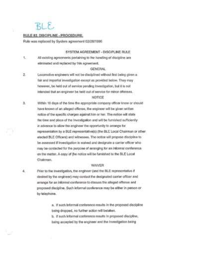 | Description: RULE 82: DISCIPLINE - PROCEDURE Rule Superseded by SYSTEM AGREEMENT - DISCIPLINE RULE GENERAL 2) Locomotive Engineers will not be disciplined without first being given a fair and impartial investigation except as provided below. They may, however, be held out of service pending investigation, but it is not intended that an Engineer be held out of service for minor offenses. NOTICE 3) Within 10 days of the time, the appropriate company officer knew or should have known of an alleged offense, the Engineer will be given written notice of the specific charges against him or her. The notice will state the time and place of the investigation and will be furnished sufficiently in advance to allow the Engineer the opportunity to arrange for representation by a BLE representative(s) (the BLE Local Chairman or other elected BLE Officers) and witnesses. The notice will propose discipline to be assessed if investigation is waived and designate a carrier officer who may be contacted for the purpose of arranging for an informal conference on the matter. A copy of the notice will be furnished to the BLE Local Chairman. WAIVER 4) Prior to the investigation, the Engineer (and the BLE representative if desired by the Engineer) may contact the designated carrier officer and arrange for an informal conference to discuss the alleged offense and proposed discipline. Such informal conference may be either in person or by telephone. a) If such informal conference results in the proposed discipline being dropped, no further action will be taken. b) If such informal conference results in proposed discipline being accepted by the Engineer and the investigation being waived, the Engineer's record will be updated accordingly. c) If such informal conference does not result in either (a) or (b) above or no informal conference takes place, the discipline imposed as a result of a hearing may not exceed that proposed in the notice of charges. INVESTIGATION 5) Unless postponed for good cause, the investigation will be held no later than 10 days after the date of the notice. 6) When practicable, the investigation will be held at the Engineer's home terminal. When that is not practicable, the investigation will be held at a location, which will minimize the travel, inconvenience and loss of time for all employees involved. When an Engineer is required to travel to an investigation at other than his or her home terminal, the Engineer will be reimbursed for actual, reasonable and necessary expenses incurred. 7) Where request is made sufficiently in advance and it is practicable, the Engineer and/or the BLE representative will be allowed to examine material or exhibits to be presented in evidence prior to the investigation. At the investigation, the Engineer and/or the BLE representative will be afforded the opportunity to examine or cross examine all witnesses. Such examination will extend to all matters under investigation. 8) The investigation will be recorded and transcribed. Copies of transcript will be furnished to the Engineer and the BLE Local Chairman no later than the date discipline is issued. If the accuracy of the transcript is questioned and the investigation was electronically recorded, the tapes shall be examined and, if necessary, the transcript will be corrected. DECISION 9) A written decision will be issued no later than 10 days after completion of the hearing. The notice will be sent by US Mail to the last known address of the Engineer and to the BLE Local Chairman. 10) If the Superintendent fails to issue a decision within such 10 day time limit or if the Engineer is found not at fault, the Engineer will be paid for any time lost and the Engineer's record will be cleared of the discipline at issue. APPEALS 11) If the Engineer is not satisfied with the decision, the BLE General Chairman may appeal to the designated Labor Relations officer within 60 days from the date of the Superintendent's decision. 12) The Labor Relations officer will respond to the appeal within 60 days from the date of the BLE General Chairman's appeal. If the Labor Relations officer fails to respond within 60 days, the Engineer will be paid for any time lost and the Engineer's record will be cleared of the discipline at issue. 13) If the Engineer is dissatisfied with the decision of Labor Relations, proceedings for final disposition of the case under the Railway Labor Act must be instituted by the Engineer or his or her duly authorized representative within one year of the date of that decision or the case will be considered closed and the discipline will stand as issued, unless the time limit is extended by mutual agreement. MISCELLANEOUS 14) If a dispute arises concerning the timeliness of a notice or decision, the postmark on the envelope containing such document shall be deemed to be the date of such notice of decision. 15) Engineers attending an investigation, as witnesses at the direction of the carrier will be compensated for all time lost and, in addition, will be reimbursed for actual, reasonable and necessary expenses incurred. When no time is lost, witnesses will be paid for actual time attending the investigation with a minimum of two hours, to be paid at the rate of the last service performed. 16) The Engineer being investigated or the BLE representative may request the Carrier to direct a witness to attend an investigation, provided sufficient advance notice is given as well as a description of the testimony the witness would be expected to provide. If the Carrier declines to call the witness and the witness attends at the request of the Engineer or BLE and provides relevant testimony, which would not otherwise have been in the record, the carrier will compensate the witness as if it had directed the witness to attend. 17) If, by operation of this agreement or as the result of an arbitration decision, the Carrier is required to pay an Engineer who has been disciplined for "time lost", the amount due shall b