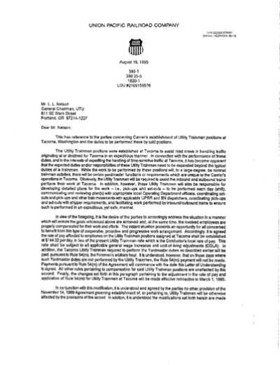 | Description: UNION PACIFIC RAILROAD COMPANY August 15, 1995 380-1 Mr. L. L. Nelson This has reference to the parties concerning Carrier’s establishment of Utility Trainman positions at Tacoma, Washington and the duties to be performed there by said positions. The Utility Trainman positions were established at Tacoma to assist road crews in handling traffic originating at or destined for Tacoma in an expeditious manner. In connection with the performance of these duties, and in the interests of expediting the handling of time-sensitive traffic at Tacoma, it has become apparent that the expected duties and/or responsibilities of these Utility Trainmen need to be expanded beyond the typical duties of a trainman. While the work to be performed by these positions will, to a large degree, be normal trainman activities, there will be certain yardmaster functions or requirements which are unique to the Carrier’s operations in Tacoma. Obviously, the Utility Trainman will be required to assist the inbound and outbound trains perform their work at Tacoma. In addition, however, these Utility Trainmen will also be responsible for developing detailed plans for the work – i.e., picks-ups and set-outs – to be performed each day (shift), communicating with reviewing plan(s) with appropriate local Operating Department officials, coordinating pick-ups and set-outs with shipper requirements, and facilitating work performed by inbound/outbound trains to ensure such is performed in an expeditious, yet safe, manner. In view of the foregoing, it is the desire of the parties to accordingly address this situation in a manner which will ensure the goals referenced above are achieved and, at the same time, the involved employees are properly compensated for their work and efforts. The instant situation presents an opportunity for all concerned to benefit from this type of cooperative, proactive and progressive work arrangement. Accordingly, it is agreed the rate of pay afforded to employees on the Utility Trainman positions assigned at Tacoma shall be established at $144.32 per day, in lieu of the present Utility Trainman rate which is the Conductor’s local rate of pay. This rate shall be subject to all applicable general wage increases and cost-of-living adjustments (COLA). In addition, the Tacoma Utility Trainmen required to perform the Yardmaster duties as described earlier will be paid, pursuant to Rule 54(m), the Foreman’s arbitrary hour. It is understood, however, that on those day where such Yardmaster duties are not performed by the Utility Trainmen, the Rule 54(m) payment will not be made. Payments pursuant to Rule 54(m) of the Agreement will commence with the date this Letter of Understanding is signed. All other rules pertaining to compensation for said Utility Trainman positions are unaffected by this accord. Finally, the change set forth in this paragraph pertaining to the adjustment in the rate of pay and application of Rule 54(m) for Utility Trainmen at Tacoma will be made effective retroactive to March 1, 1995. In conjunction with this modification, it is understood and agreed by the parties no other provision of the November 14, 1969 Agreement governing establishment of, or pertaining to, Utility Trainmen will be otherwise affected by the provisions of this accord. In addition, it is understood the modifications set forth herein are made without prejudice to either parties position(s) and are designed to address the special and unique circumstances existing at Tacoma and shall not be cited for any reason by either party in any future forum and proceeding. Finally, the terms of this arrangement will not be utilized or cited by either party for the purpose of seeking adjustments in any other rates of pay on any other position. The parties agreed that this Letter of Understanding may be cancelled by either party upon the serving of a fifteen (15)-day advanced written notice on the other party advising of the intent to cancel this accord. If this arrangement is cancelled, the Utility Trainman positions at Tacoma will automatically revert to the applicable Conductor’s local rate of pay. If the foregoing properly reflects our understandings regarding this matter, please so indicate by affixing your signature in the space provided below; returning one fully executed copy to my office at your earliest opportunity. Yours truly, AGREED: |